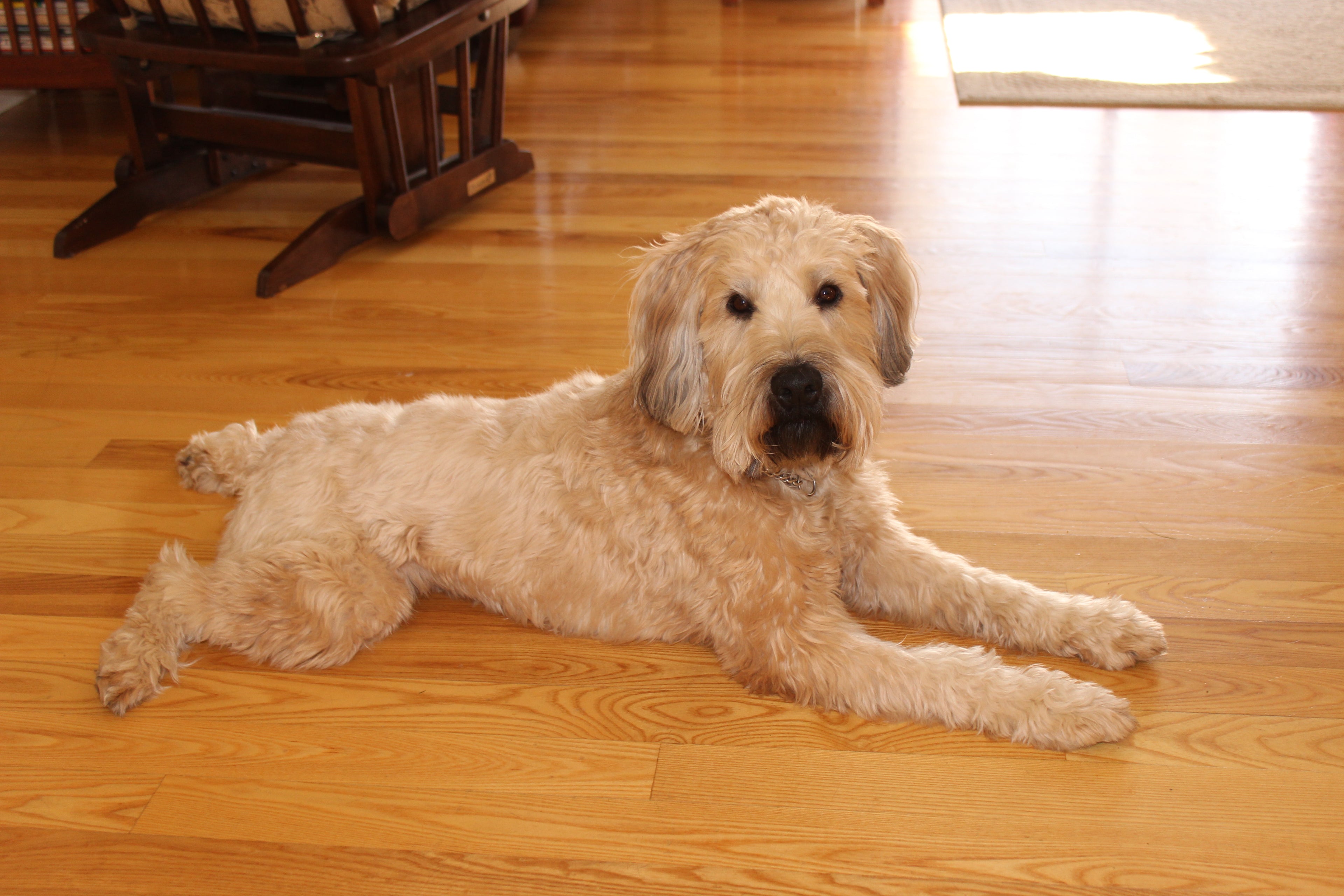 A Soft Coated Wheaten Terrier, Finn enjoys being photographed in exchange for treats, chewing dryer sheets and chasing moths.